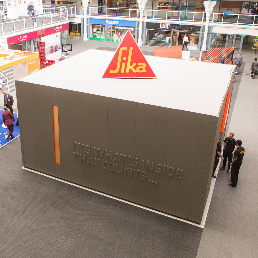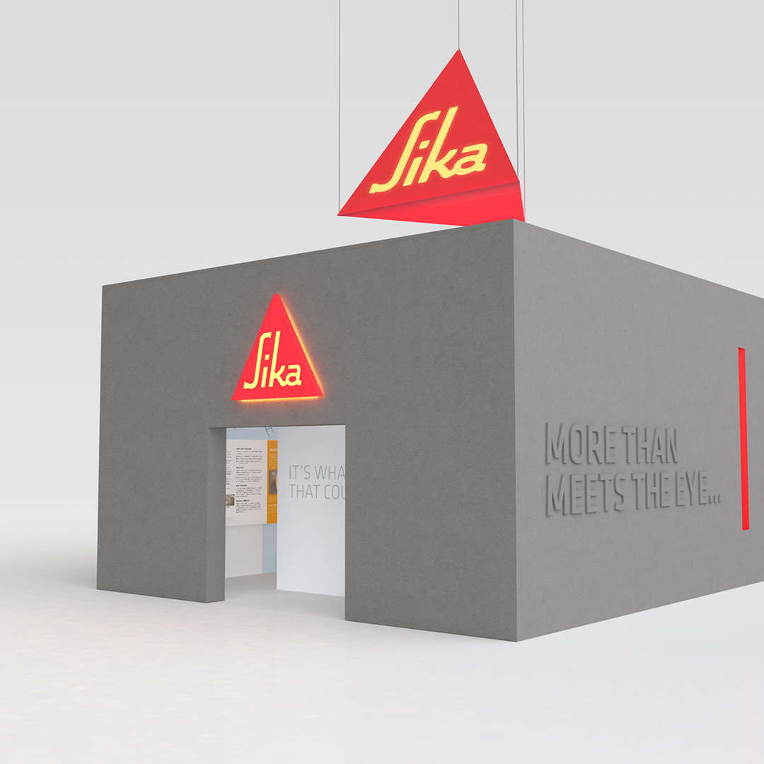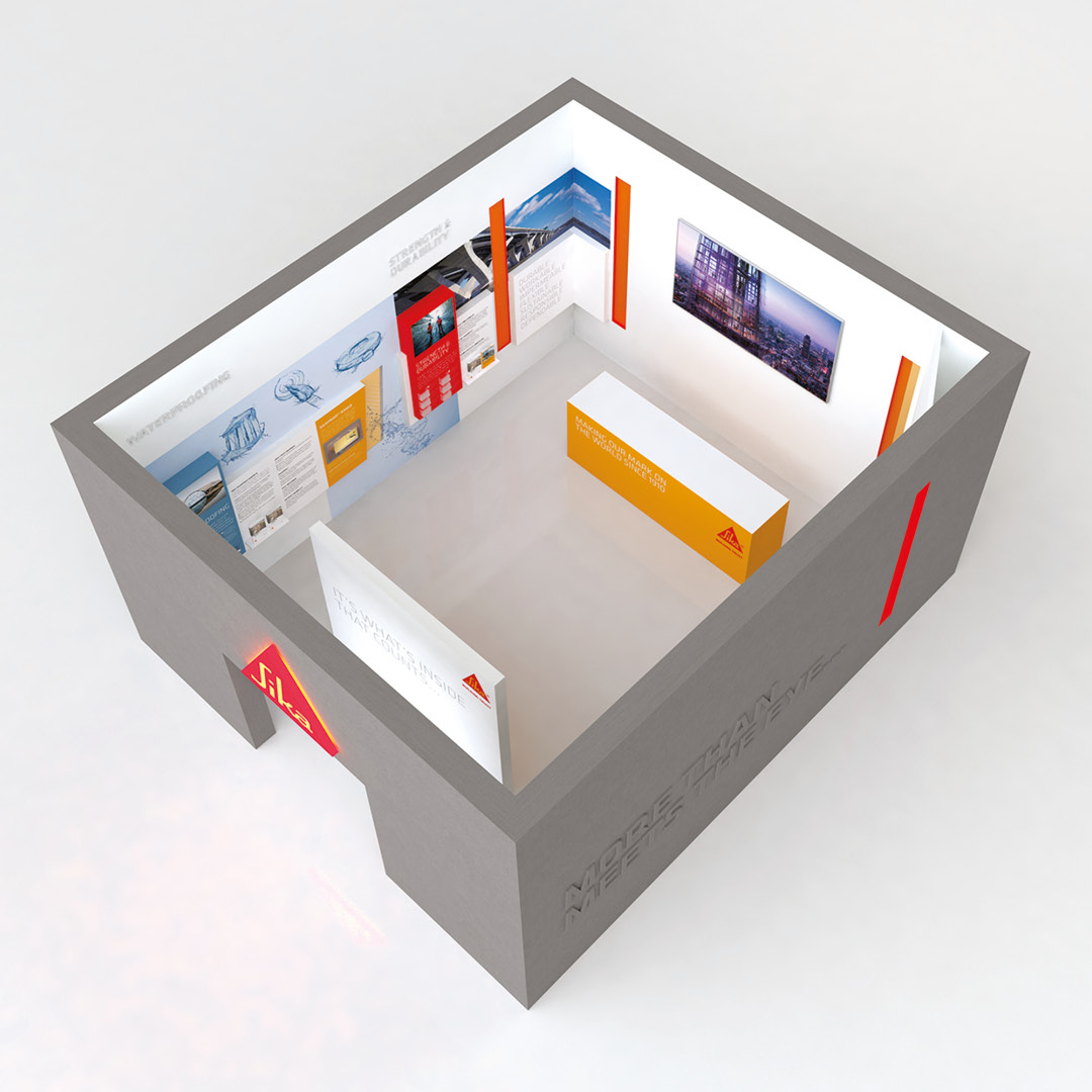 Design and artwork of a unique ‘concrete box’ stand for chemical company Sika to showcase their specialist waterproofing products at the Evolving Concrete exhibition. The stand itself was coated in Sika’s products and featured a living concrete sculpture, accompanied with striking video content and bespoke waterproofing giveaways.